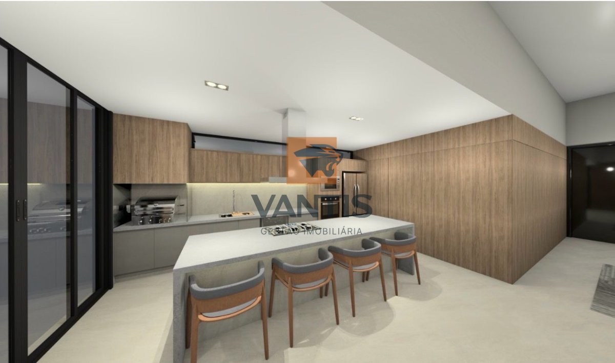 A área social apresenta pé-direito elevado e integração direta com a cozinha gourmet e área externa, com destaque para a conexão visual com o paisagismo.